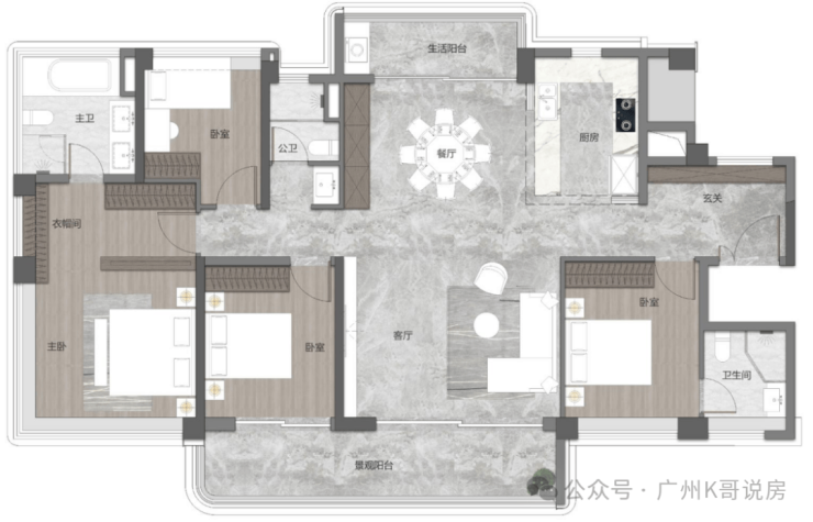 138㎡四房户型,做到了四开间朝南,约16.6米大面宽,而且餐厅带飘窗,做到了南北对流,主卧还配置了独立衣帽间和超大收纳柜,很适合二胎家庭居住。