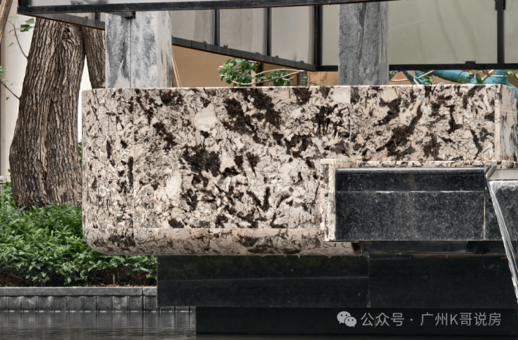 茶室底座,用的是巴西进口的雪山银狐奢石。这类奢石,因为独特的透光性,一般用于顶豪室内装饰,如今却被保利大胆用在园林公区,奢华程度可见一斑。