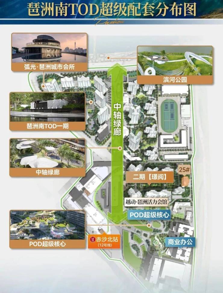 同步以琶洲南TOD、华樾为支点,沿岸打造国际滨河公园、3个高端会所、商业组团等多维城市配套。