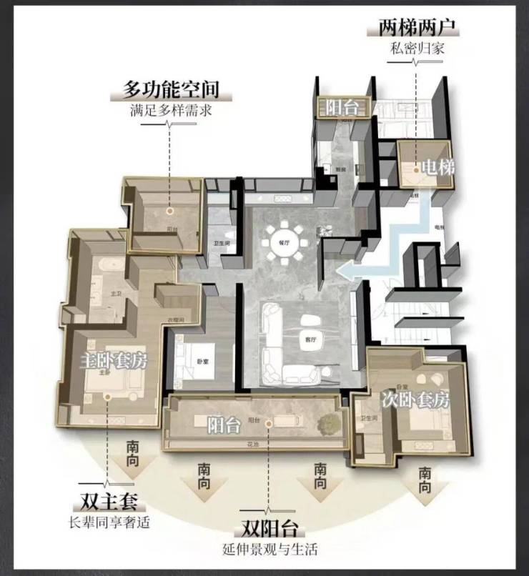 约220㎡大平层,户户四开间朝南,户户南北对流大方厅,户户两梯两户专属归家,户户双主套双阳台……
