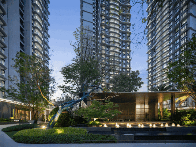 朴树、冬青、乔木等名贵树种。再加上奢石等特色材料的运用,整个园林景观有着豪华酒店的质感,四季都能有不同的景观。