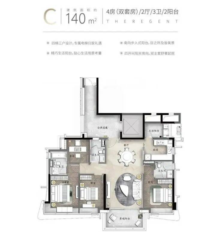 产品迭代期,打磨顶奢质感。项目迭代出140-480㎡多元户型,涵盖平层与叠墅,适配高端改善与家族传承需求[1][3]。邀美国AEcom、梁志天等大师操刀,全南北阵列排布,弧形玻璃幕墙质感十足,270°环幕江景无遮挡,专梯入户设计彰显尊崇[3]。全屋一线精装交付,搭配6000㎡天CLUB会所、岛尖马术场等配套,品质拉满[1][3]。