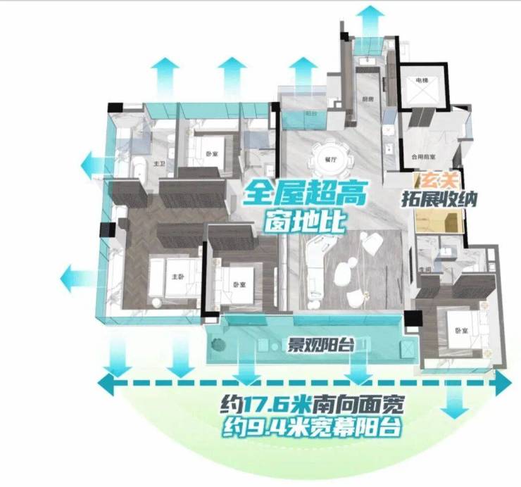 户型三开间朝南,为了获取更大面宽视野,项目还将全屋的窗地比做到38%。