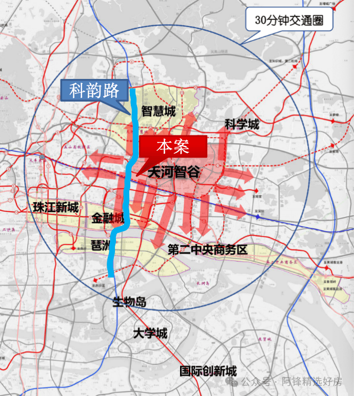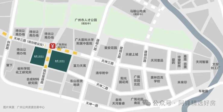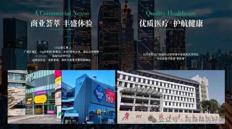 教育配套是项目核心亮点,业主子女由广东实验中学天河学校(九年一贯制)统筹学位,并可参与清华附中湾区学校摇号,项目自身配建幼儿园,形成“幼儿园+九年制+名校摇号”的12年教育闭环。交通方面,项目紧邻广园快速、科韵路等主干道,非高峰时段20分钟可达金融城、琶洲,规划地铁19号线智谷西站(未获批)未来4站直达珠江新城。商业配套依赖周边资源,1公里内有已开业的ING未来印综合体(含盒马鲜生、星巴克等),15分钟车程可达奥体商圈、美林天地;医疗上,广州医科大学附属中医医院(三甲)距项目仅500米,步行约7分钟可达。生态资源方面,北侧紧邻规划中的54万㎡人才公园,西侧为车陂涌湿地公园,步行5分钟可享生态休闲空间。
