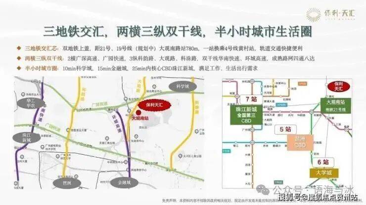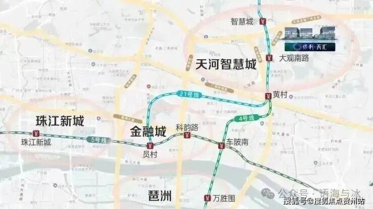 项目距离21号线大观南路站约1.2公里,步行大约20分钟可达,一站即可换乘4号线前往金融城及琶洲地区,四站后可在员村换乘5号线直达珠江新城。