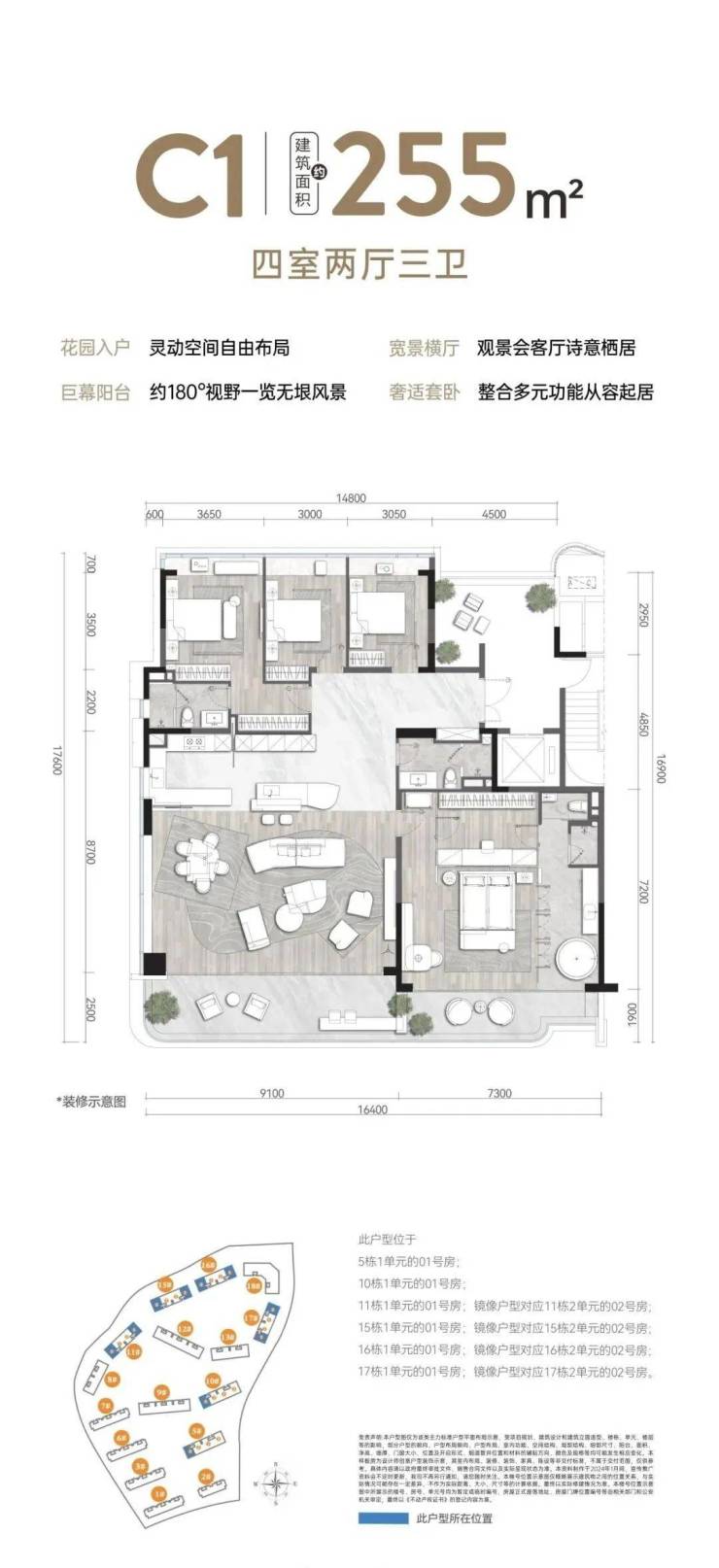 在建筑面积约255平米户型中,设计采用私梯入户、阳光电梯厅、入户花园,营造入户礼仪,为业主提供一个私享的归家空间。