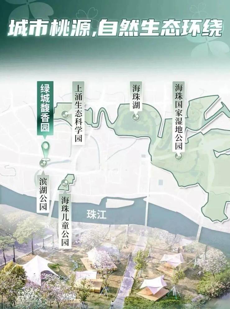 从外部来看,项目背靠河涌,打造了一个滨河公园,与周边的海珠儿童公园、海珠湖、海珠国家湿地等,形成了巨大的天然的生态背景板。