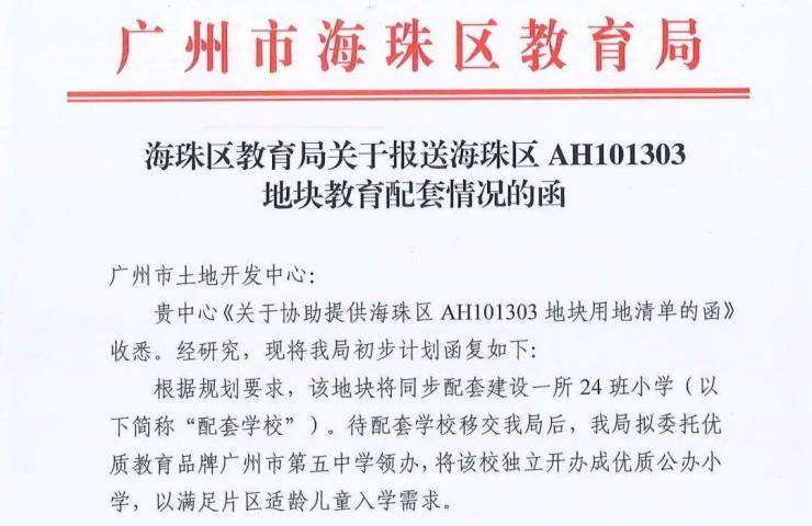 重要的是,根据2024年10月海珠区教育局公示,这所配建的学校将委托广州市第五中学领办。