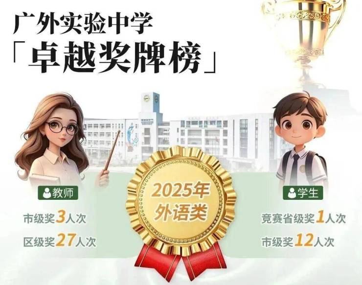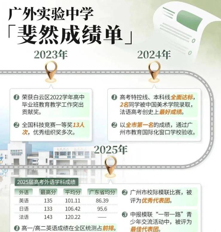 2025年,高一高二英语成绩,在全区统测位居前列,高考同样辉煌,其中英语最高135分、法语最高143分,妥妥广州第一梯队。