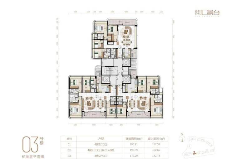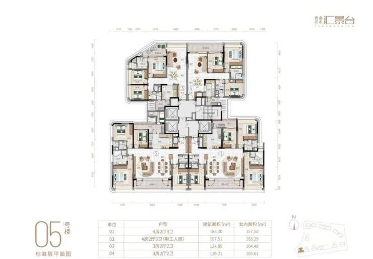项目由14栋12层小高层组成,产品涵盖123-352㎡三至五房,共8类户型,户型实用率约82-84%
