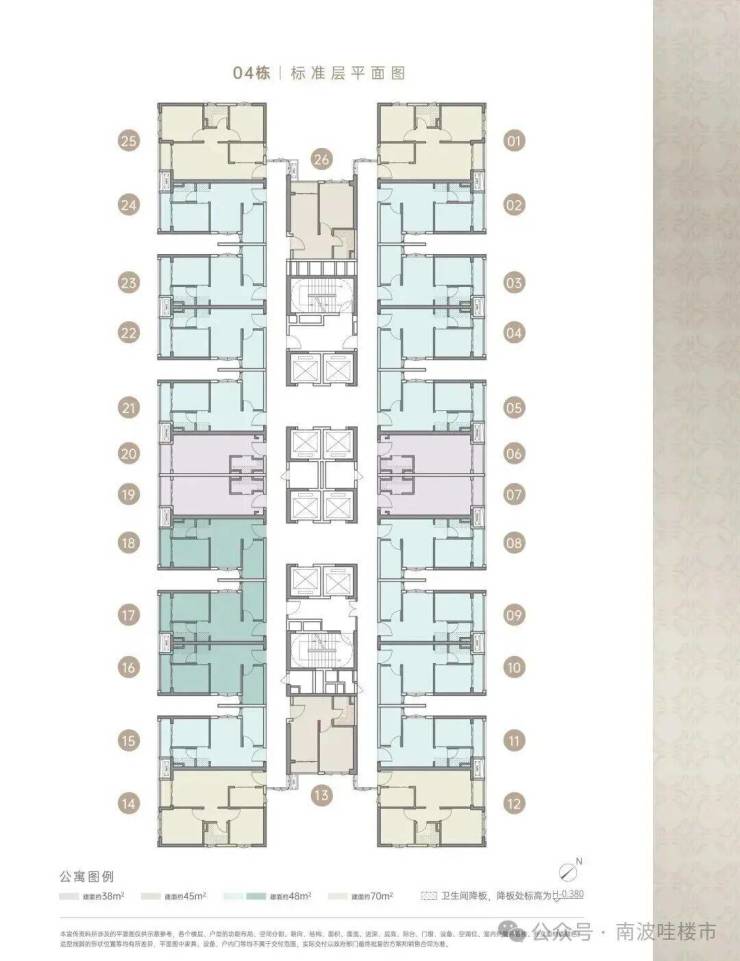 住宅由4栋48层建筑组成,分别是1栋、2栋1/2单元和3栋,3梯5/6户,4栋是商务公寓45F(1470户),5栋是幼儿园。