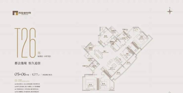 有254㎡、277㎡等面积。254㎡的三房分布在t10、t23、t26栋的3-9层,2梯3户,有三房三卫;277㎡的四房分布在t10、t23、t26栋的3-8层,2梯3户,有四房两卫或三卫。