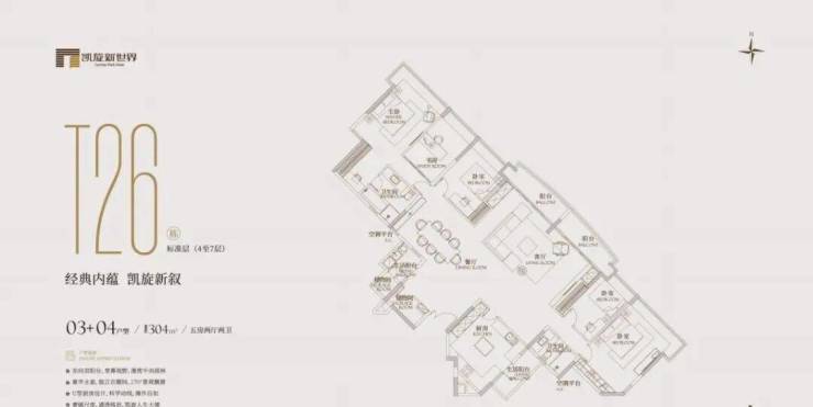 面积为304㎡,分布在t23栋的3-8层及t17栋的3-26层,2梯3户或2梯4户,有五房两卫或五房三卫。