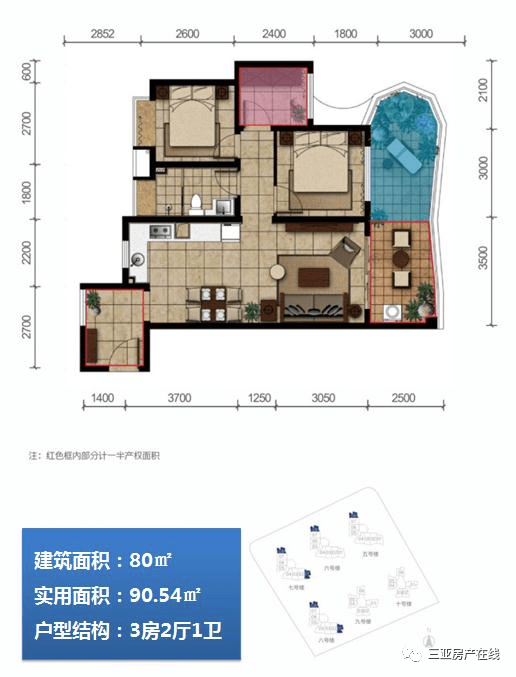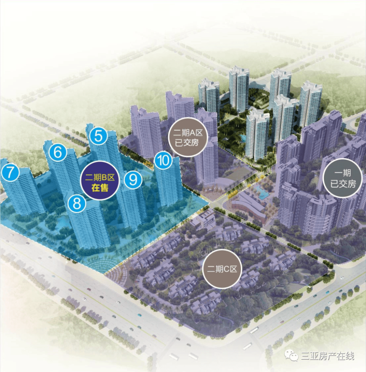 2、在售信息:二期B区总建筑面积76882.5㎡,由5-10号楼共6栋高层组成,共计1100户,层数为26层,停车位1041辆,产权为70年大产权