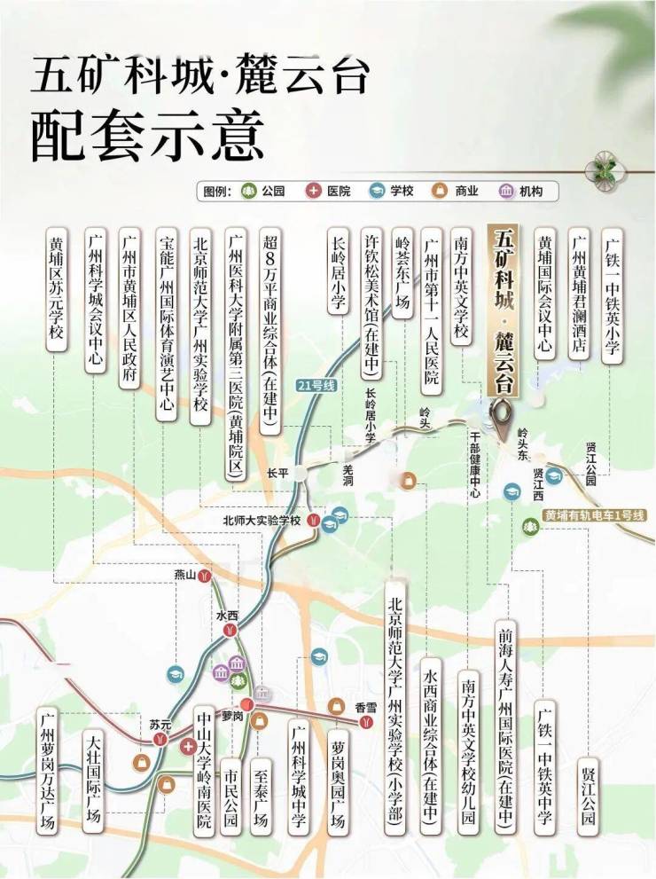 项目距三甲医院市第十一人民医院(黄埔院区)约500米,距综合医院前海人寿广州国际医院约440米。距广州市干部和人才健康管理中心约996米,距大湾区首个LEED金级认证、医养结合的高端养老社区——泰康之家·粤园,约835米。