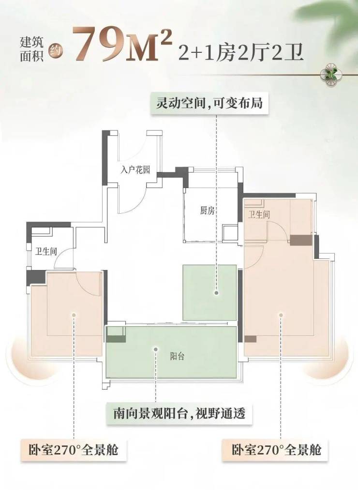 79平户型三开间朝南的设计,双卧室均配备L型飘窗;让阳光能毫无遮挡地洒进每个房间;超大宽厅,既可以作为家庭聚会的大客厅,也能通过灵活隔断改造成第三间独立卧室;