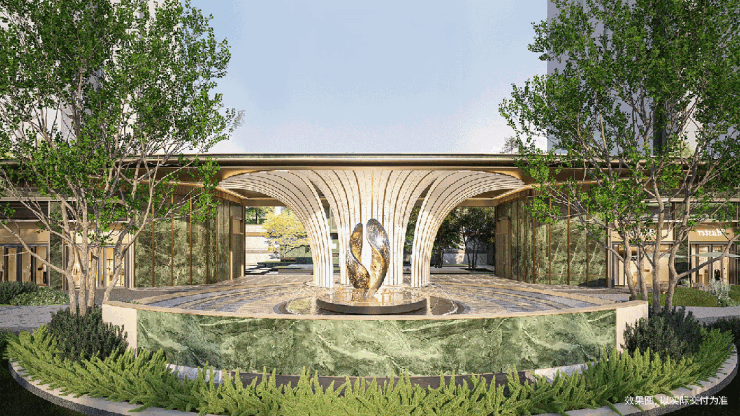 高约7.8米,宽近50米的行政级大门,香槟金铝板与岭南榕树意象完美融合,营造出星级酒店般的尊崇体验