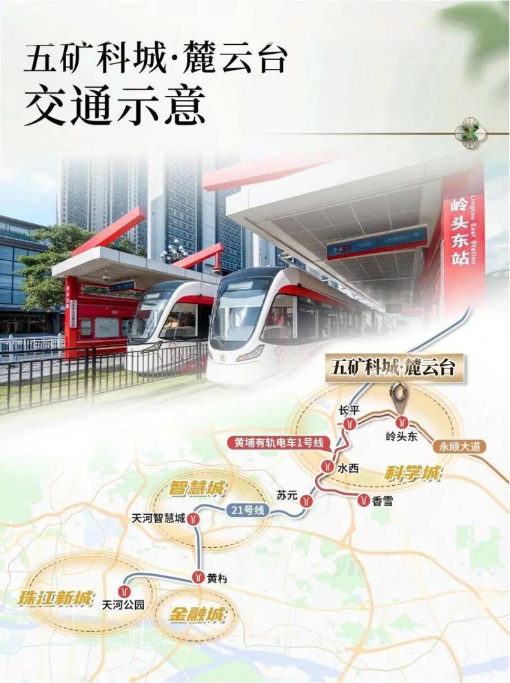 麓云台就在黄埔有轨电车1号线岭头东站旁边,距广州地铁21号线长平站约3.3公里,可以直达黄埔区府板块,或者5站长平换乘21号线去往天河也足够便利。如果自驾的话,永顺大道可以直达黄埔科学城,经过广汕路也能直达天河智慧城。