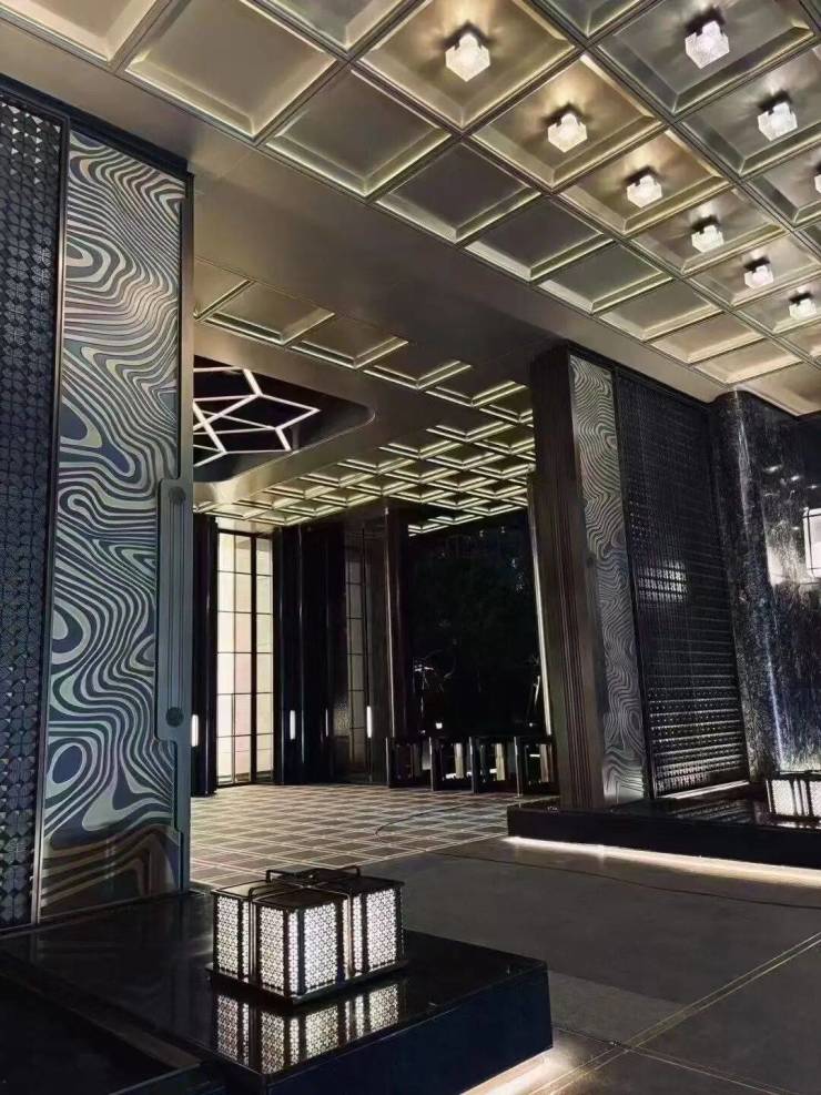 鎏光门庭入户大堂,采用豪宅海派手法设计,参考亚洲瑰丽酒店风格,打造“一步一景 一堂三景”五星级酒店式归家礼遇;材质上采用定制双色石材、巴西铂金钻奢石,并植入百年非遗西关手打铜工艺,彰显高级质感与格调。