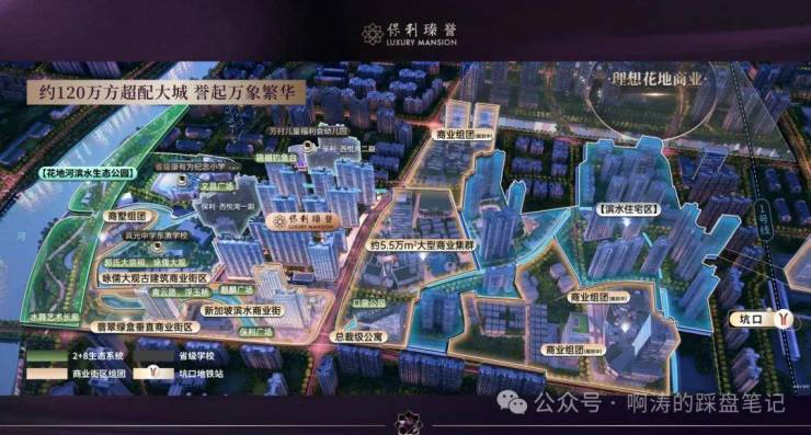 保利作为花地湾片区连片开发最重要的城市运营商,打造约120万方超配大城,涵盖了高端住宅、酒店、滨水商业街区、公寓、文化等多为复合业态,实现真正意义上的超配大城。