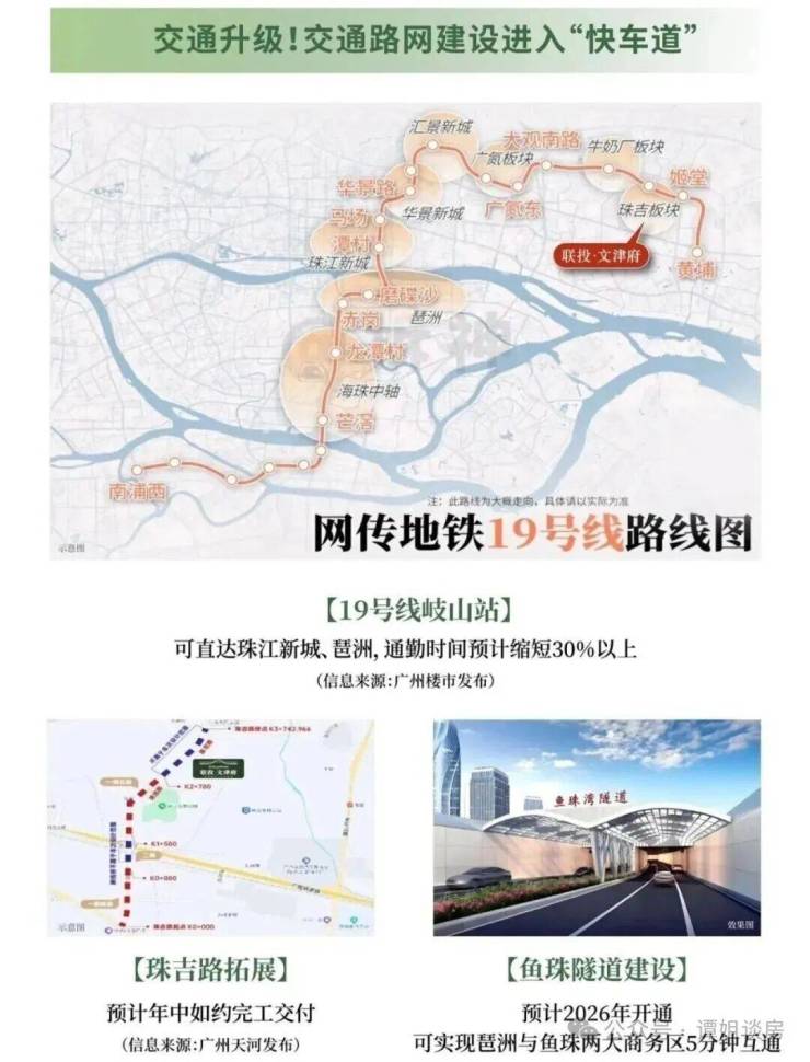 项目周边是没有地铁的,最近的21号线、4号线都去到了几公里外了。近邻地铁19号线珠吉站规划中、7号线2期姬堂站规划中。