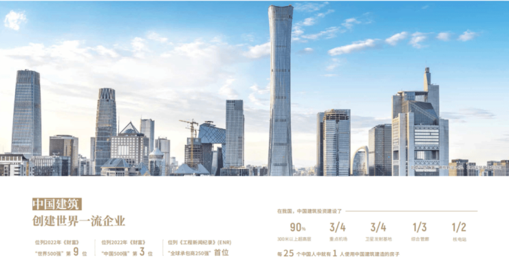 【中国建筑】2023年《财富》世界500强排名第13的大型国有企业,全球最大的住宅工程建造商和中国最大的房屋建筑承包商,是由中央国资委委任的十六家以房地产开发为主业的国有企业,连续荣获标普、穆迪、惠誉等国际三大评级机构信用评级A级(全球建筑行业最高级信用评级)。