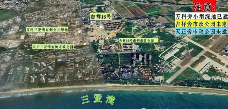 ❷依据控制系详细规划以及相关文件的规定:吉祥16号项目南侧的空地(待建),天正三亚湾项目南侧的空地(待建)、以及万科三亚湾项目西侧的地块(已建),将被分别建成大小不一的市政公园,或市政绿地空间。