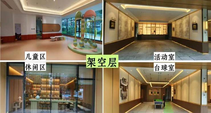 ❸项目部分住宅楼的底层架空区域内,设计有健身区、棋牌室、儿童乐园、台球室、阅读区等,各具使用功能的活动空间。