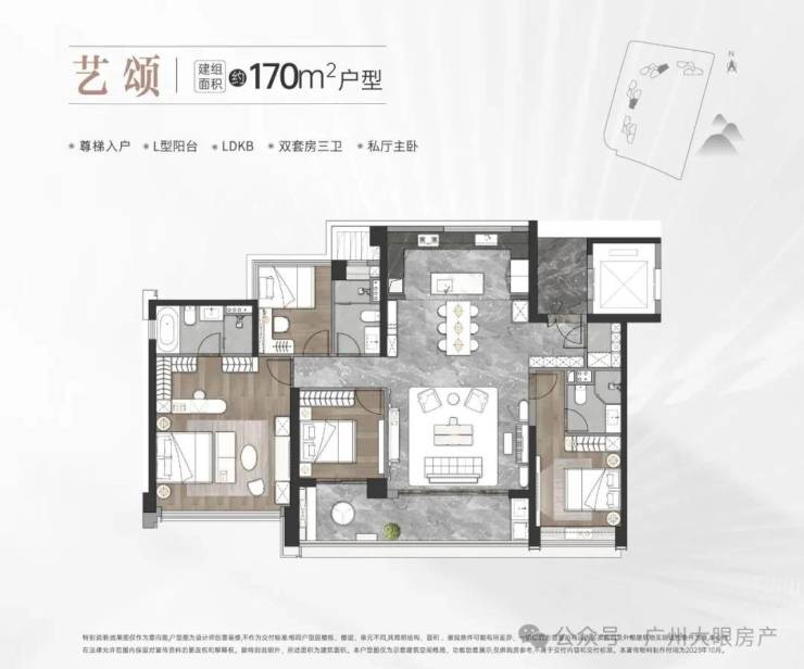中海麓府体量不大,仅4栋住宅,40多层高的住宅(1#高40层,2-3#高44层,5#高41层),两梯三户,底下规划有1所12班幼儿园+1栋自持物业,货量在500套上下,它的面积段有三种,分别是建面约126㎡三房、143㎡和170㎡的四房