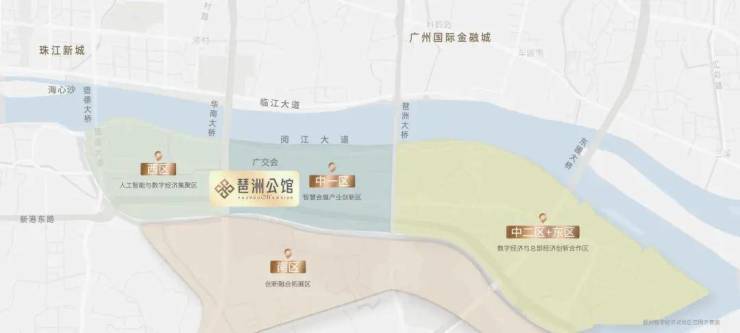 琶洲与珠江新城、金融城形成广州CBD黄金三角,琶洲定位为国家级人工智能与数字经济试验区、省级经济开发区、市级总部经济集聚区等创新平台称号,是广东省谨此一个在市中芯经开区,将打造“数字+会展+总部”融合创新的产业新高地。