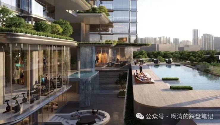 社区打造有中央大园林、多功能泛会所,标配泳池、健身房、棋牌室、儿童乐园等;设计了专属天桥系统,业主下楼,可通过天桥连廊走去太古里。