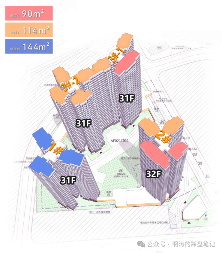 1栋:这栋全是144㎡的大户型,3梯3户,4房2厅3卫,南北通透双阳台,开间约5.6米,但应该只推部分梯腿。