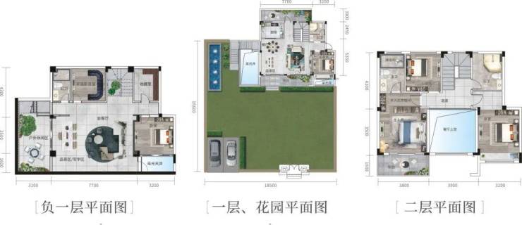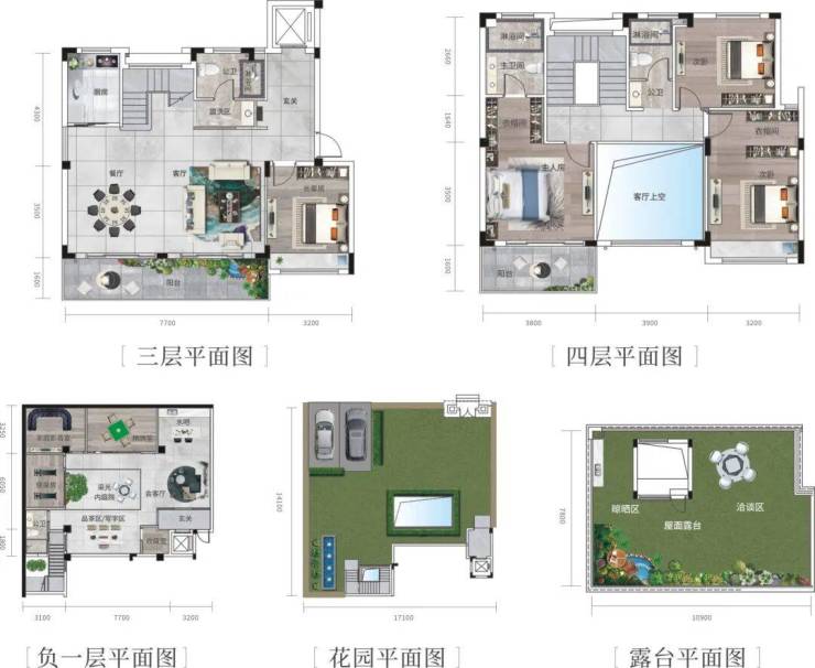 新中式叠院:建筑面积169-192㎡,花园160-338㎡。