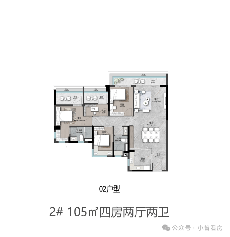 125㎡四房在舒适性上进一步提升,四开间朝南,阳台长度达到6米,连接客厅与次卧,主卧配备独立衣帽间和干湿分离卫生间,动静分区清晰,适合改善家庭 。