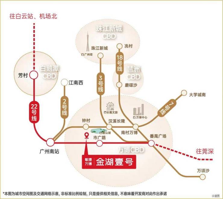 出门约800米即达市广路站(百度地图直线距离),1站番禺广场、2站万博中心、3站琶洲CBD、4站珠江新城;规划中26号线更是潜力可期。 新光快速、广台高速等“五纵五横”立体交通,畅连广州各核心城区。