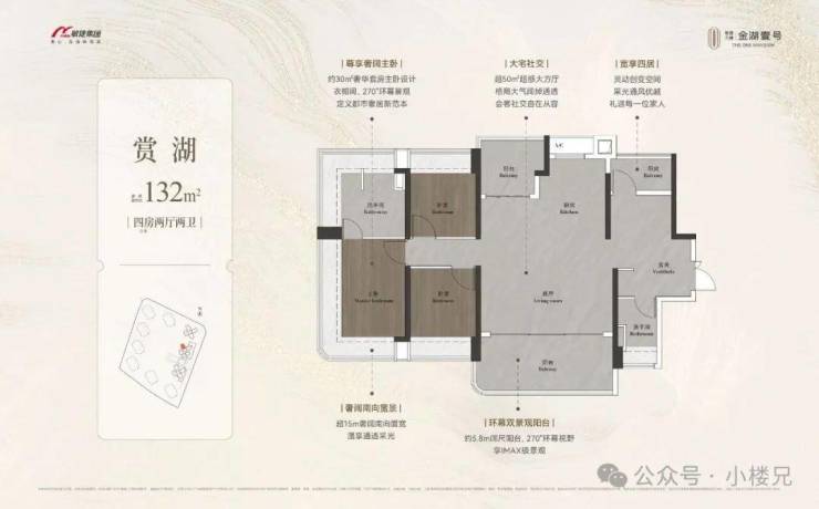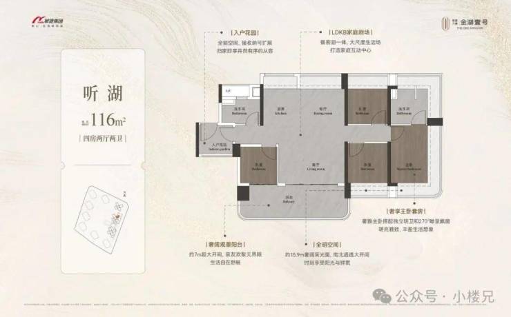 北临约1630亩金山湖公园,仅约400米步行即达。一面尽揽城市璀璨万象,一面私藏湖光潋滟逸境,繁华与繁花,在此共生。