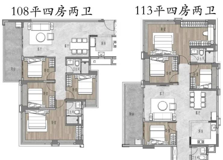 四房设计了108平和113平,其中,113㎡四房两卫,堪称保利珠江天悦的平替,是西部最小的望江四房。四开间朝南,南北对流,南向超大阳台,样板间展现出上一代产品 130㎡的尺度感,LDKB一体化设计,会客空间宽敞。