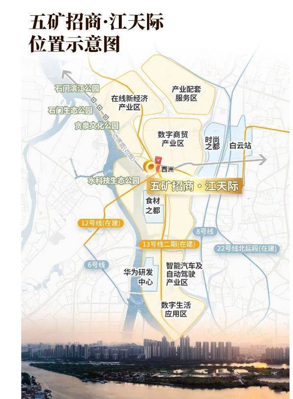 五矿招商江天际位于广州市白云区广海路,是槎头站TOD项目的一部分,由五矿地产、招商蛇口和广州地铁三大开发商共同打造。该项目总建筑面积约24万㎡,占地面积约为6.8万㎡,规划户数为1407户,车位比达到1:1.19,容积率为3.6,绿化率为30%。作为白云区罗冲围片区的重点发展项目之一,五矿招商江天际不仅享有独特的一线江景资源,而且其地理位置优越,未来有望成为该区域乃至广州市的重要地标。