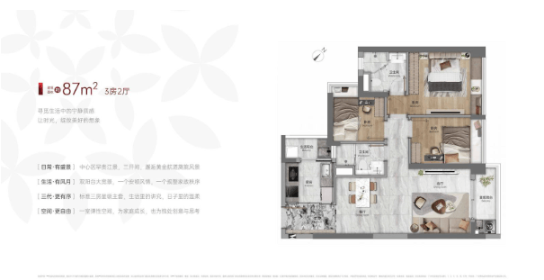 整个项目只有6栋楼,半围合式分布,45度“风车”户型联排,做到不同的户型的主要室内空间都朝南向排布,尤其卧室空间,几乎做到了100%朝南。
