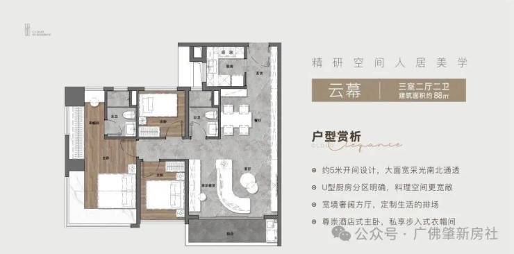 建面约88㎡三房两厅两卫;