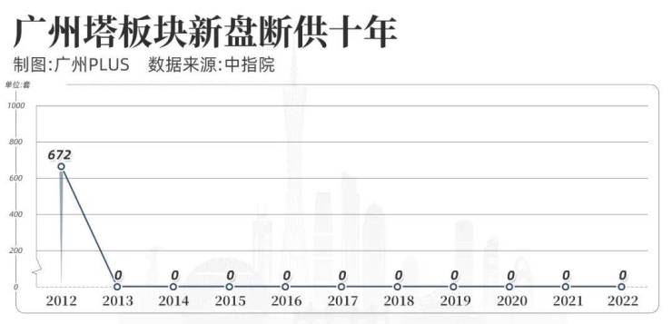 根据中指院数据显示,从2012年开始,广州塔板块便再无新盘入市,这一断供便是足足十年之久。