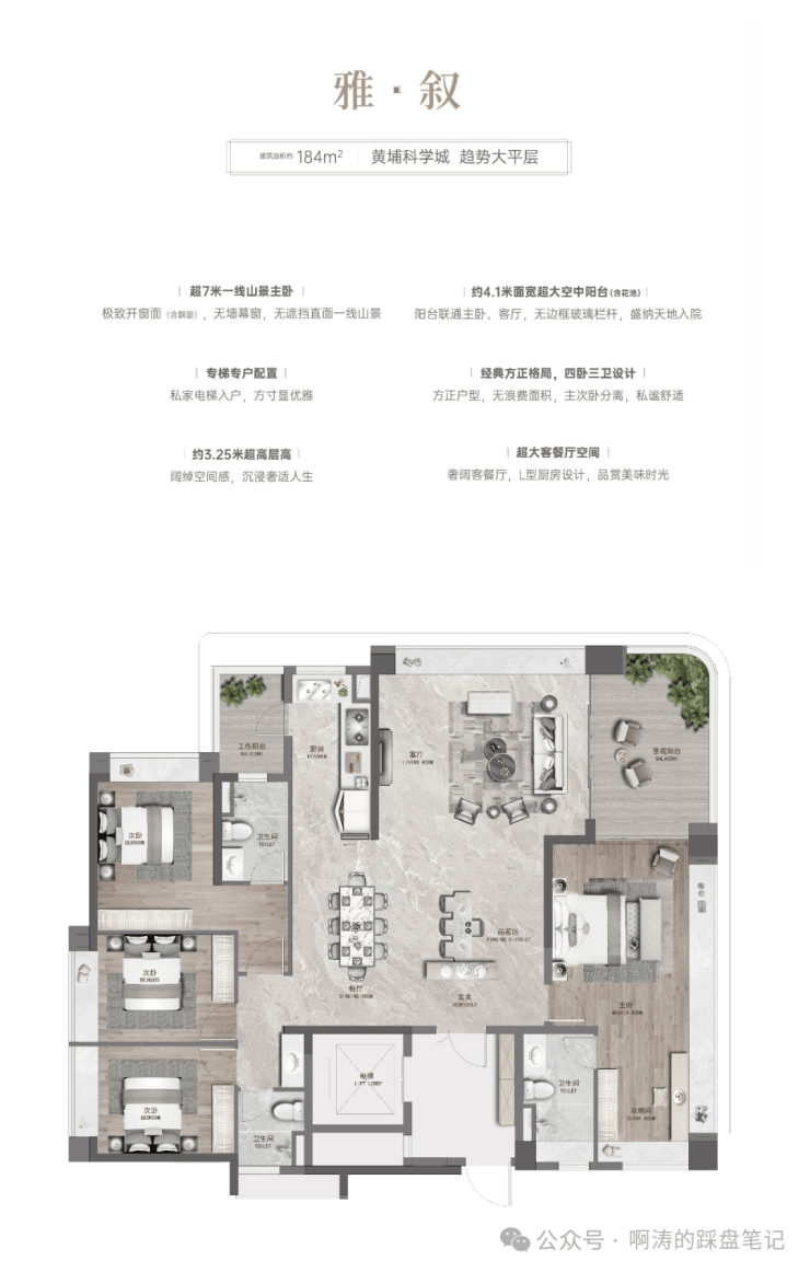 全能第四代住宅。阔绰楼间距,视野开阔,户户观山,户户观园。户型设计以空间享受型为主,三面采光、南北通风对流。每户均带入户花园满足入室清洁及收纳,户内格局方正,大开间,大景观阳台,IMAX主卧超宽景观,空间户型可随意设计调整。