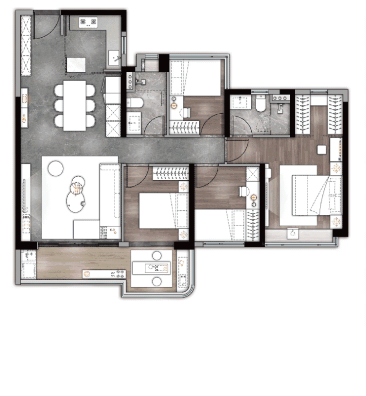 建面约89~126㎡三房至四房,注入客餐厨一体化、超大面宽阳台、与270°主卧落地窗等前卫设计,功能强大。