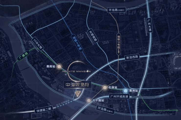 项目周边的交通配套较为便利,位处于广佛线石溪、燕岗站之间,距离约1公里;与在建的地铁十号线大干围站直线距离仅有约700米,未来石溪板块可通过十号线直达天河CBD区域,实现与天河板块的强链接。