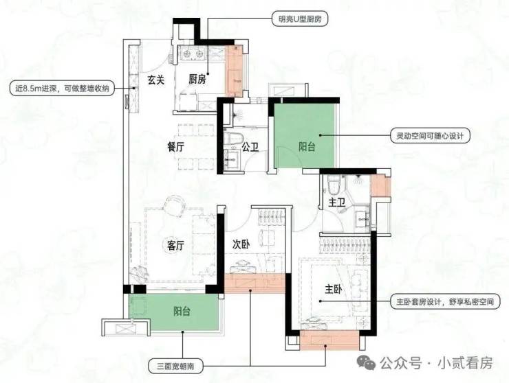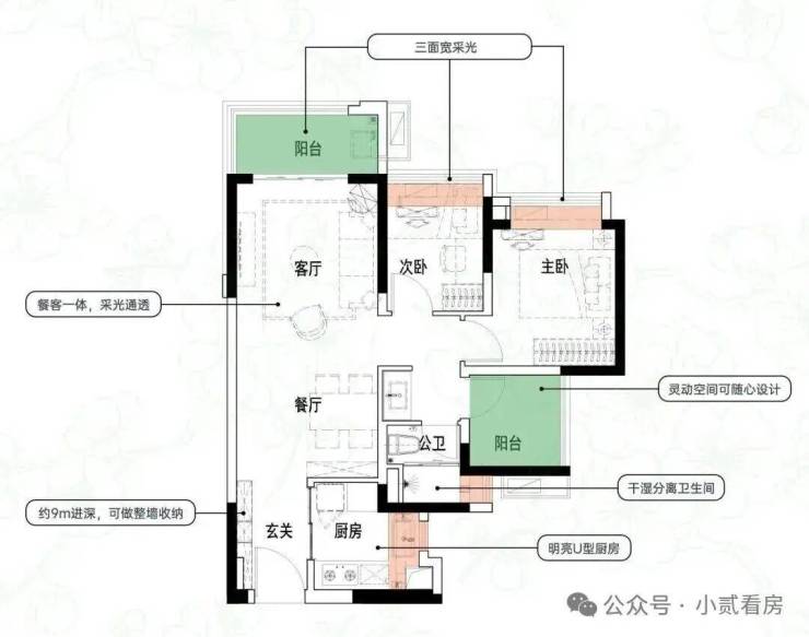 建面约84㎡3空间2厅2卫|得房率约93.5%