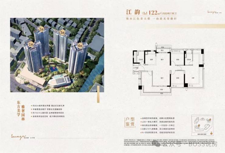 建面约 120 平的四房两厅两卫是公区 LDBK 一体化设计,主卧带超大转角飘窗,三面采光;