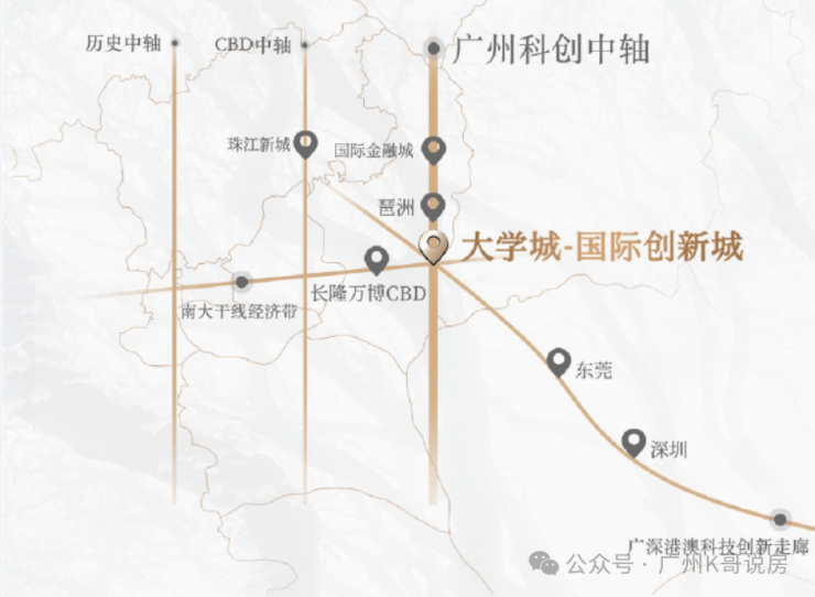 项目位于大学城二期-国际创新城板块,国际创新城共十平方公里,有暨南大学和广州医学院,整个创新城包括北翼的生物岛,核心的大学城和南翼的南岸起步区,南村地区,化龙地区,国际展贸城,在空间结构上形成了一核两翼。