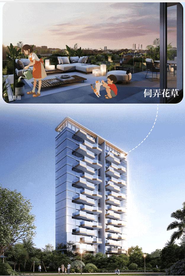 错层通高阳台:错层阳台2层通高设计,高度约5.4米,可摆放吊椅、绿植、隔出小茶室,四代宅空中花园体验;