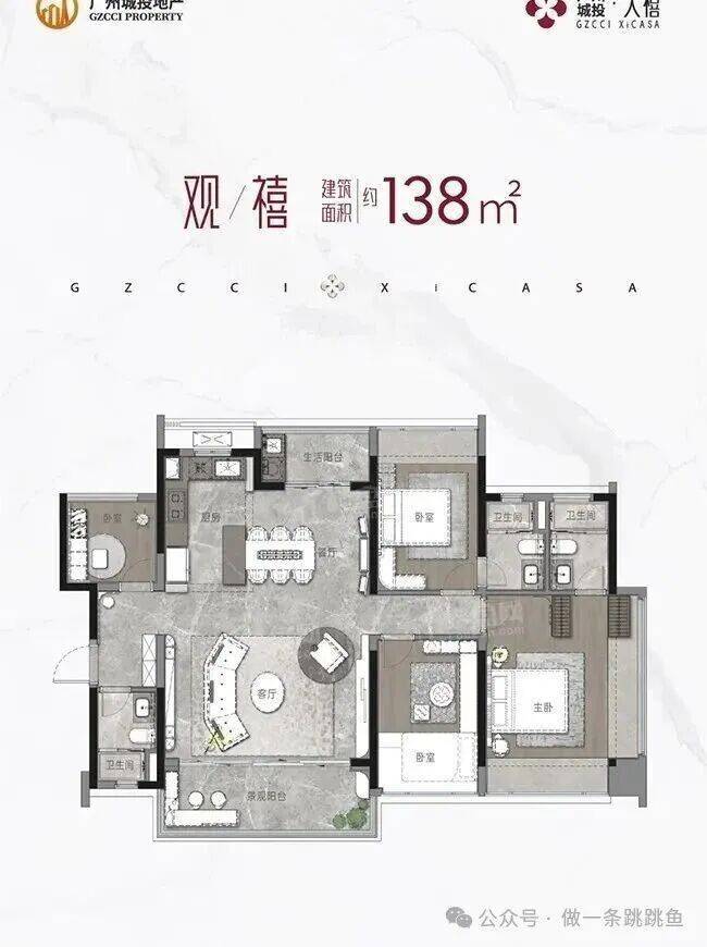 城投天禧的小区整体为半围合布局,向南全开敞,同时还有超尺度中央园林。每一个户型客厅都做到约5.6米的开间,大开间、大方厅的设计打破了传统户型的空间局限,让居住体验更加舒适与宽敞;而且设计精致、装修豪华,满足了不同购房者的不同需求,首推1栋、2栋的平均使用率做到100%,这两栋楼已经封顶了。目前项目在售1栋、2栋建面约108平3房、138平4房。户型图如下: