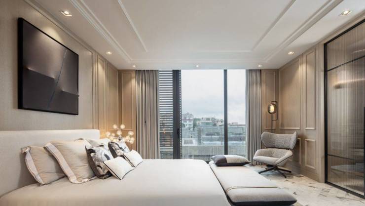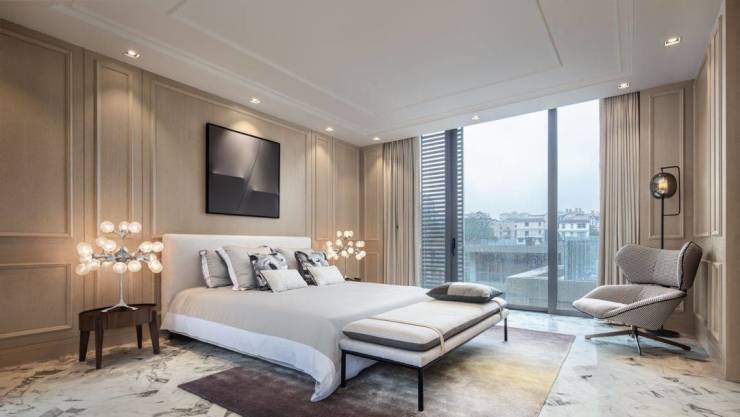 精研意大利进口家私,主卧套房以独立卫浴、衣帽间及半山露台定义奢适尺度。
